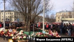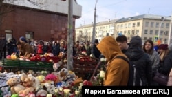 У сгоревшего ТРЦ "Зимняя вишня" возник стихийный мемориал: люди несут цветы и игрушки, зажигают свечи.