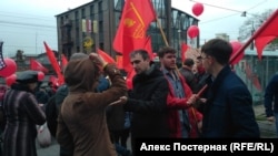 Возмущенный мужчина говорит, что выступает против кооперации монстрантов с КПРФ. Агрессивно реагирует на "либералов" на митинге, сообщает наш корреспондент во Владивостоке.