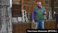 На прощание обходим двор и любуемся другими коллекциями Высоких – из оконных ставен, карбазных досок, кованых железных деталей, скоб и гвоздей. Наличники, хозяин говорит, собрал с разных домов, которые сносили в городе и его окрестностях.