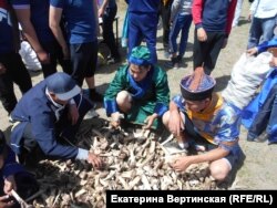 – Кость изначально вся в мясе, она варится, как на суп, кипятится. Потом мясо все снимается, сгрызается. Чтобы кость была плотнее, нужно кипятить ее очень долго. Костный мозг, который находится внутри, уплотняется. И соответственно кость становится прочнее. Вытаскиваешь, сушишь это все и едешь на соревнования. Кости били и наши бабушки. Они, когда скакали на коне, разбивали кости, держа их за спиной. Это были такие игры у них, это было очень зрелищно. И мы хотим продолжить правила наших предков и тоже начали заниматься ломанием хребтовой кости, – говорит Донгор Ангархаева, участница "Ёрдынских игр".