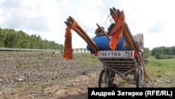 Александра я встретил на федеральной трассе "Амур" в 220 километрах от Читы, на подходе к деревне Новоберёзовка Забайкальского края. Невысокий человек в спецовке тащил за собой тележку с самодельным государственным номером "Якутия 14", на которой уместились все его пожитки – сборная юрта, печка, одежда и провизия. Несмотря на алюминиевый каркас, гружёная тележка, по словам путешественника, весит под 100 килограммов.