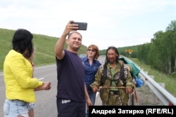 А останавливаются так часто, что скорость путешествия снижается до 2,5–3 километров в час, почти в 2 раза медленнее обычной пешей прогулки. 5 километров пути мы вместе преодолели за полтора часа, почти половину этого времени Александр общался с поклонниками – я насчитал 11 машин и один мотоцикл. Из тех же, кто проезжал мимо, каждый 3–4-й водитель сигналил якуту в знак поддержки.