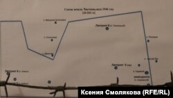 Экспозиция Чистюньгала размещается в подвале музея в Топчихе, где также расположен ЗАГС. На стенах – множество артефактов: фото лагеря, его обитателей, "вертухаев", схемы размещения объектов, которые удалось восстановить. Мы спускаемся по темной лестнице вместе со Светланой Тельновой, Еленой Басмановой и Анной Бочило. Они всматриваются в фотографии охранников лагеря.