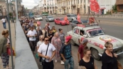 Люди скандируют: "Мы вышли сами", "Позор федеральным каналам", "Я, мы, Он, Она - за Фургала вся страна", "Мы в ответе за Россию" , "Хабаровск, мы с тобой" , "Долой царя" , "Фургала" домой, "Путина в отставку", "Руки прочь от Байкала"," Нет выборам в три дня", "Памфилову под суд". Исполняли песню:" Вставай страна огромная". По информации участников акции, полицейских не видно. Участники также скандировали: "Свободу Беспалову!".