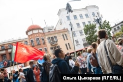 Как обычно, участники шествия несли множество флагов. Помимо советских, которые преимущественно несли коммунисты, а также флагов Хабаровского края было и несколько необычных. Павел принес на акцию флаг Санкт-Петербурга. Говорит, его передали ему жители Северной столицы в знак поддержки.