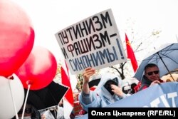 На маленьких и больших плакатах разноцветными красками было написано: "Антихрист – не в Америке. Он в Кремле", "Путинизм и фашизм – синонимы", "Путинизм и жизнь несовместимы", "Путин – удавка для России".