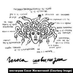 "У шовинизма разные голоса, кто-то открыто ненавидит тебя, а кто-то, чтобы не выходить из зоны собственного комфорта, советует не обращать внимания, равнодушное молчание – это тоже шипящий голос шовинизма. Не молчите. Выходите из зоны комфорта. Спускайтесь со своих пирамид. Вас это тоже коснется, эта Горгона превратит вас в каменных истуканов. Это уже случилось со столькими людьми в РФ и не только" – из инстаграма Сэсэг Жигжитовой.